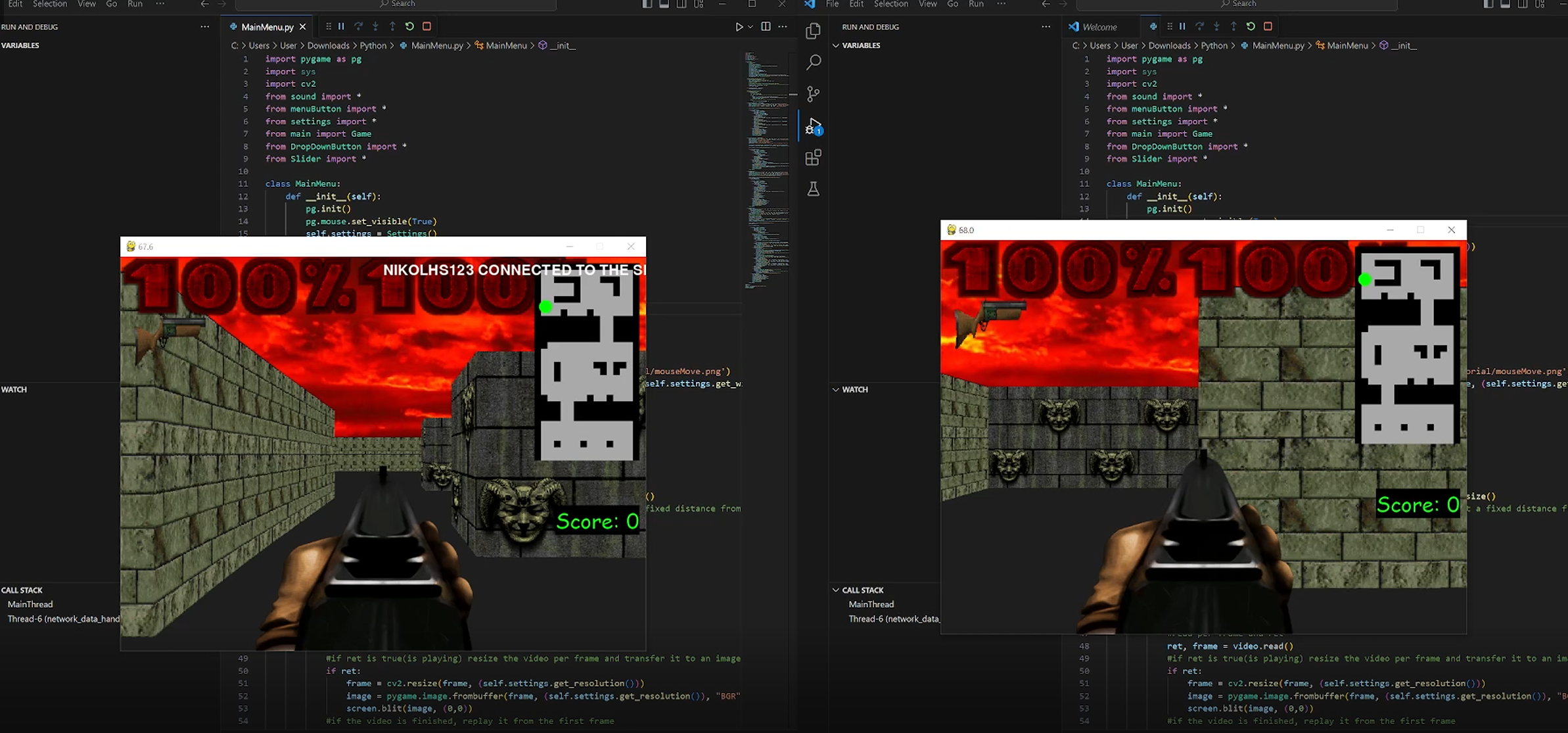 Implemented in Pygame, with sprites and collisions. Support for single player, multiplayer and online multiplayer.